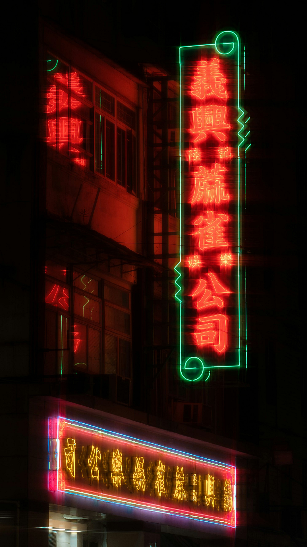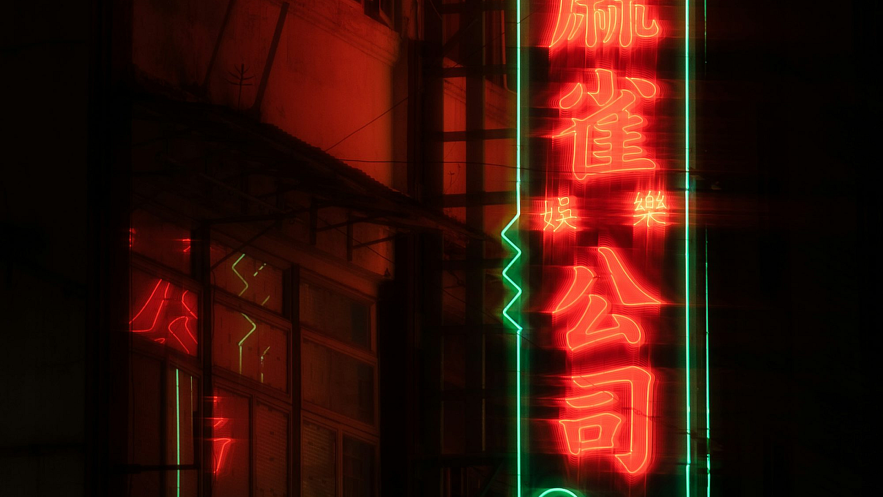 A vibrant wallpaper featuring a building bathed in the glow of a bright neon sign at night. Perfect for a dynamic desktop or mobile background.