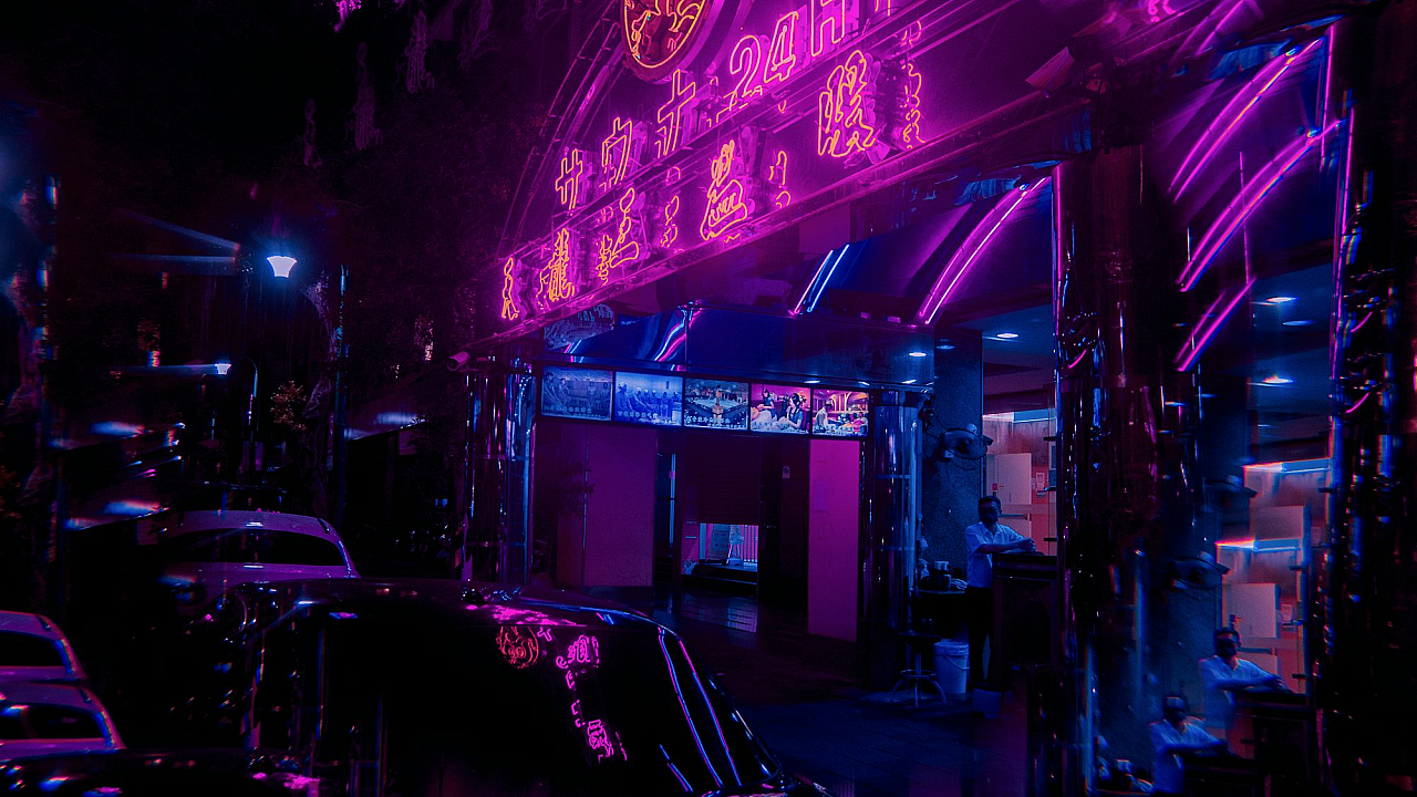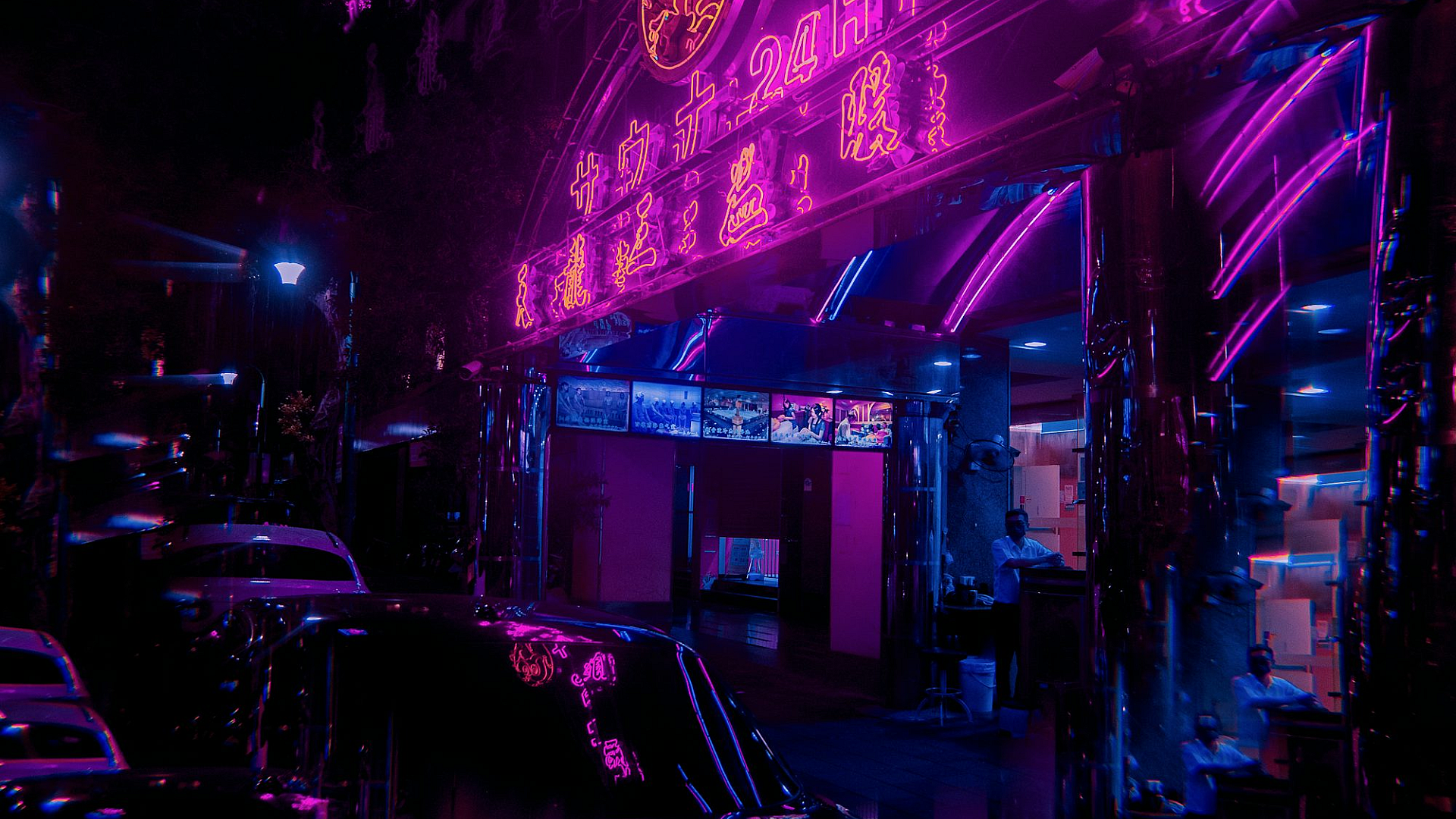 building, sign, lights, night, city, architecture, urban, wallpaper, background, design