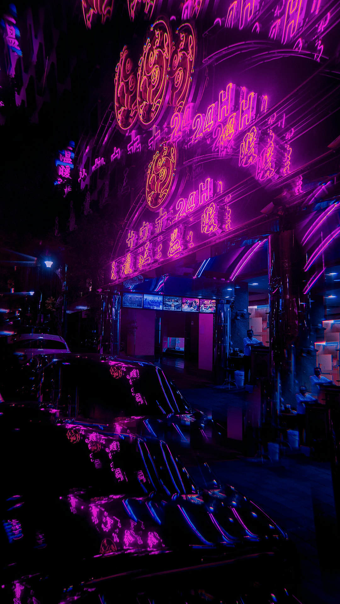 This wallpaper features a striking image of a building at night, illuminated by bright lights and showcasing a prominent sign. It offers a vibrant and modern aesthetic.