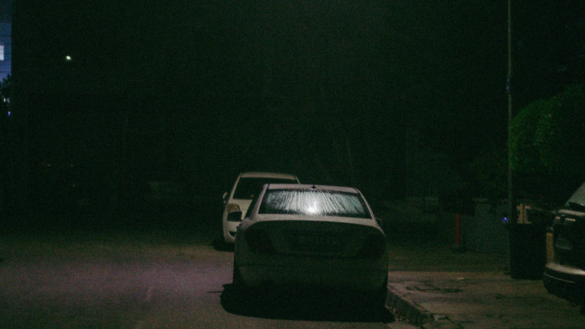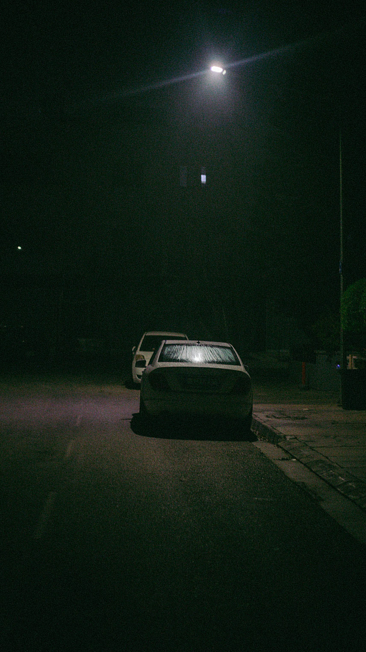 A captivating wallpaper featuring a lone car parked on a dark, quiet road at night. The scene is illuminated by subtle streetlights and the car’s own faint glow.