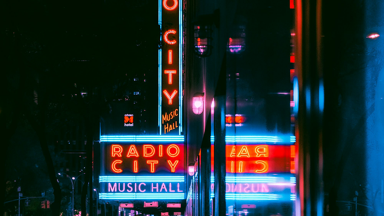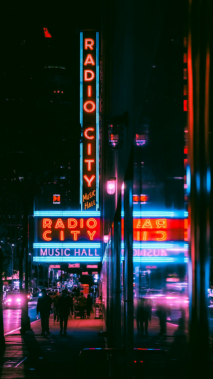 A captivating wallpaper featuring a bustling city street at night, illuminated by vibrant neon signs, with a prominent Radio City sign adding a touch of iconic charm.