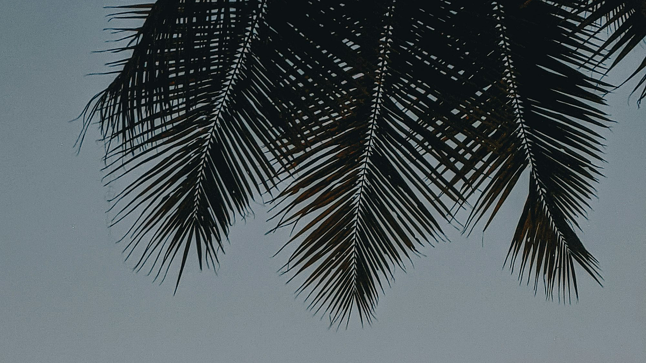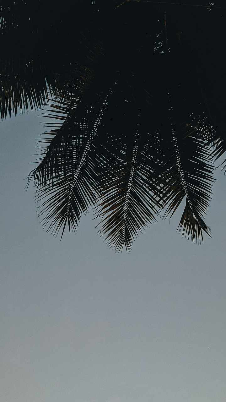 A serene scene featuring two giraffes gracefully standing beneath the shade of a lush palm tree. Perfect for a peaceful desktop background.