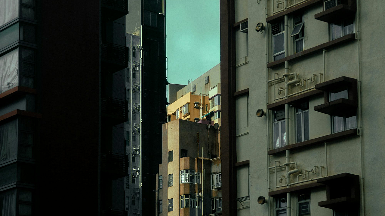 Wallpaper A Person Walking Down a Street Between Two Buildings