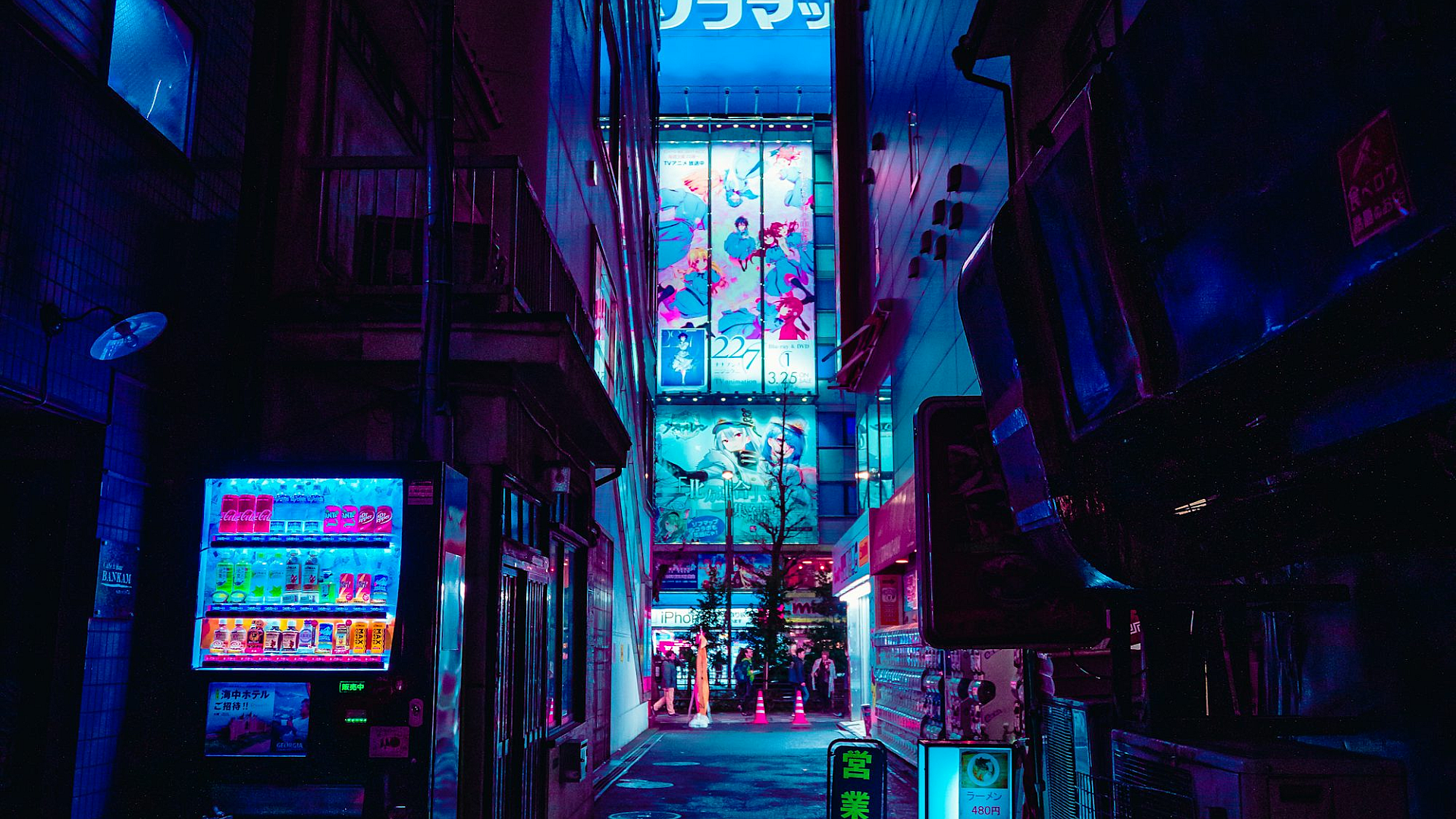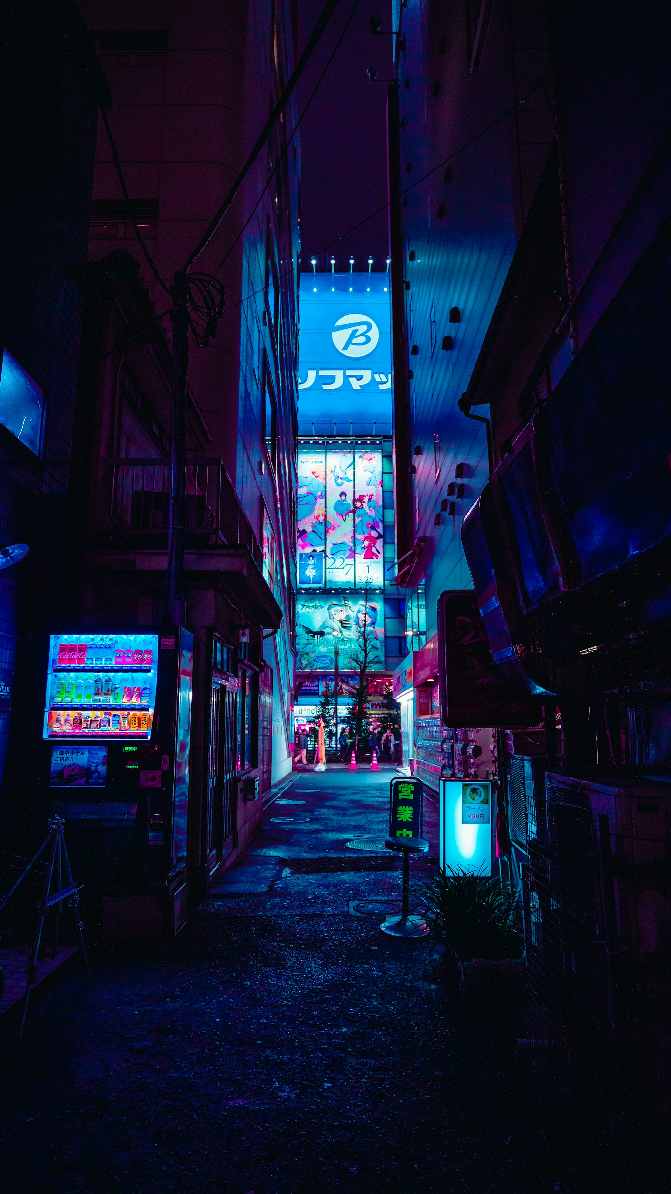 Immerse yourself in the vibrant darkness. Neon signs illuminate a dark alleyway, creating a captivating and mysterious atmosphere.