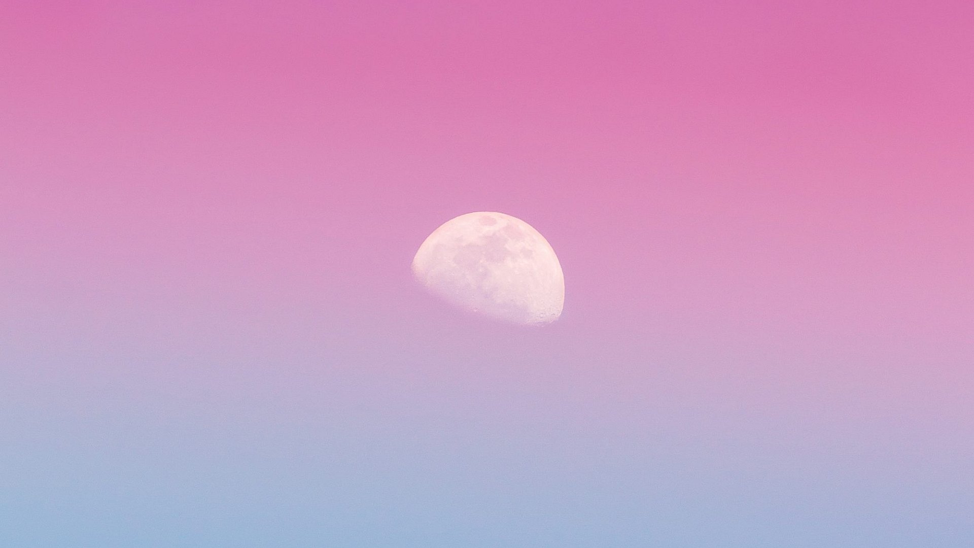 A serene dreamscape wallpaper featuring a pink and blue gradient sky, with a distant moon adding a touch of magical tranquility. Perfect for a calming atmosphere.