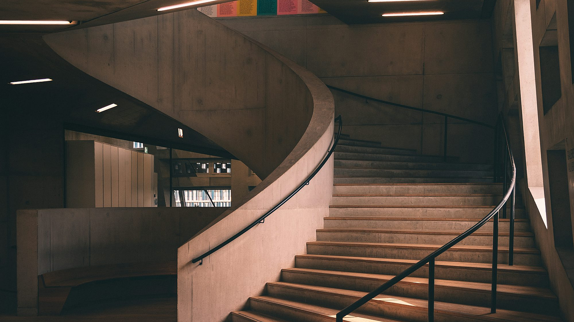 Wallpaper A Staircase in a Building with Light Streaming Through