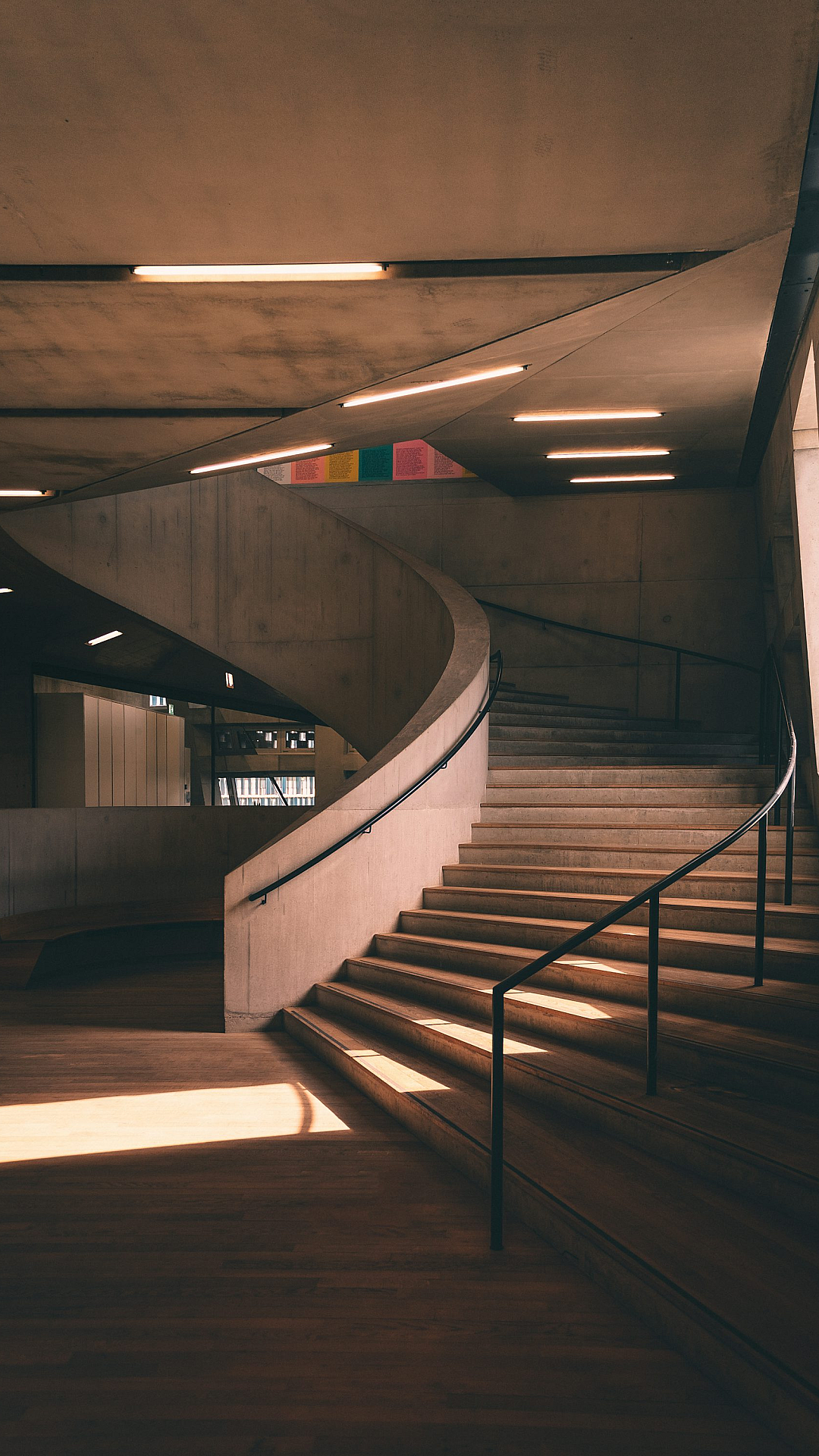 A minimalist wallpaper featuring a sleek staircase within a modern building, bathed in the warm glow of natural light streaming through a window. Clean lines and bright illumination create a serene atmosphere.