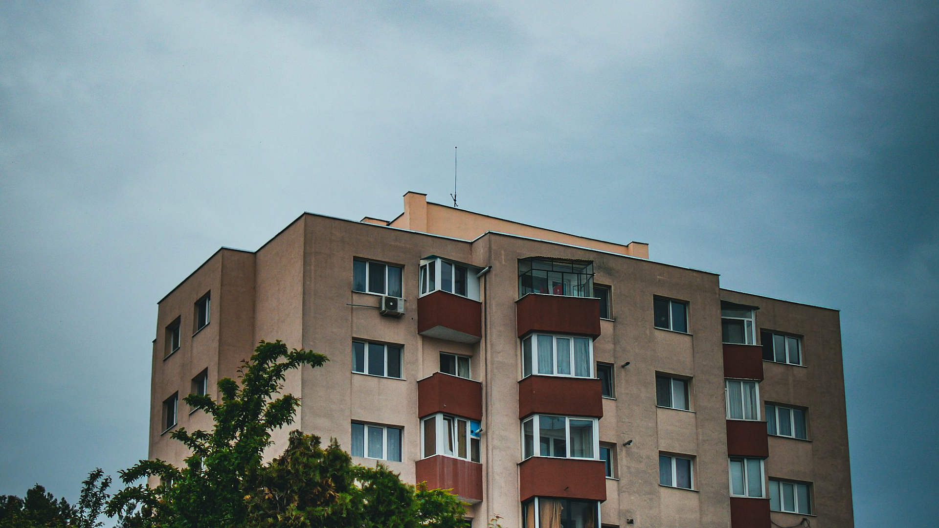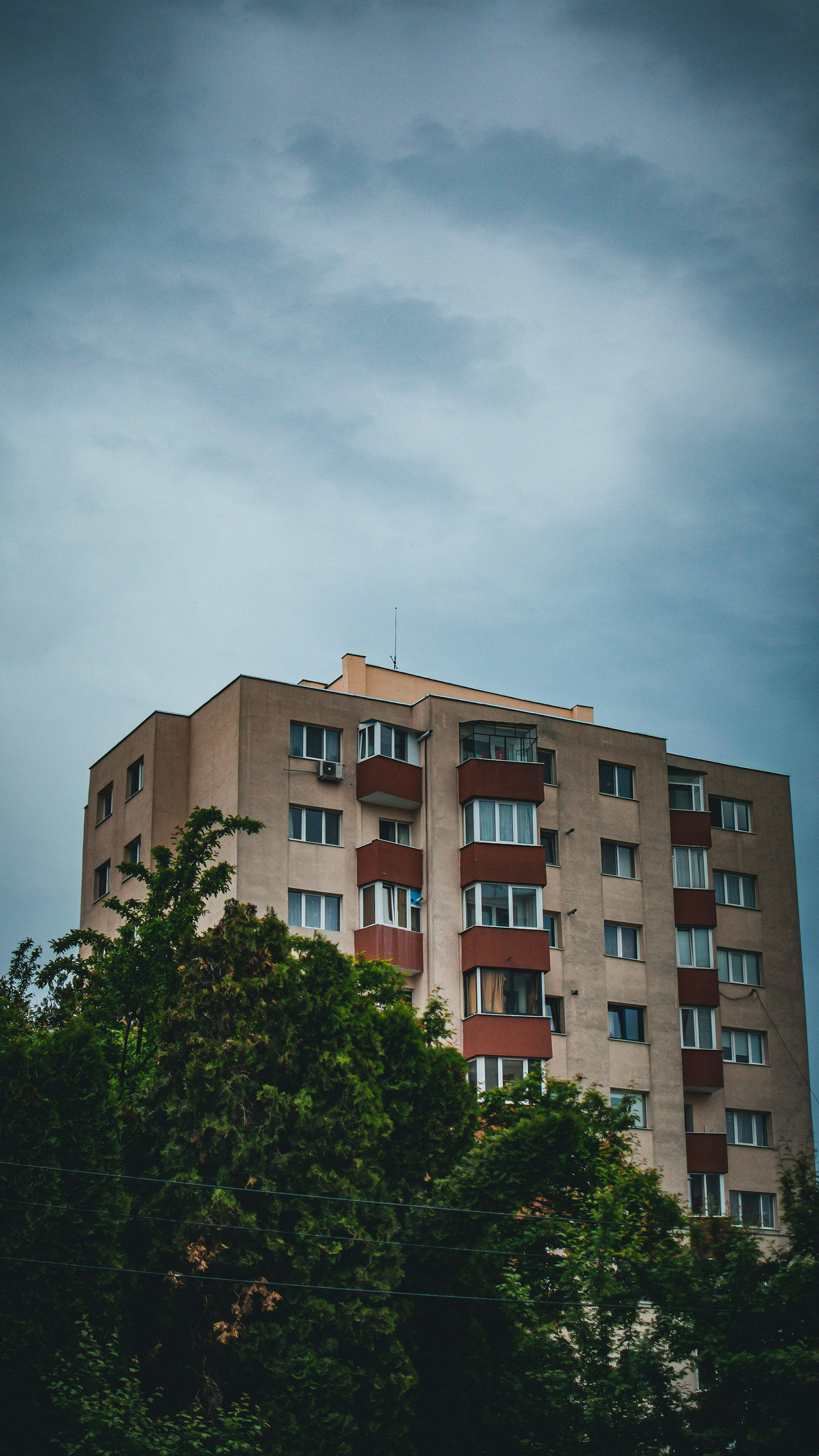 This stunning wallpaper features a tall building with countless windows, standing majestically beside a vibrant collection of trees. A beautiful contrast between urban and natural landscapes.