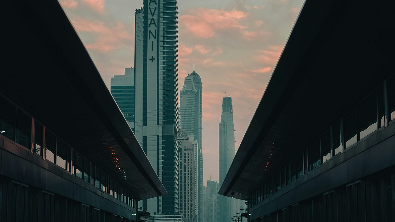 This wallpaper features a stunning view of a bustling city, seen from the perspective of a train station. High-rise buildings and urban sprawl stretch out to the horizon.