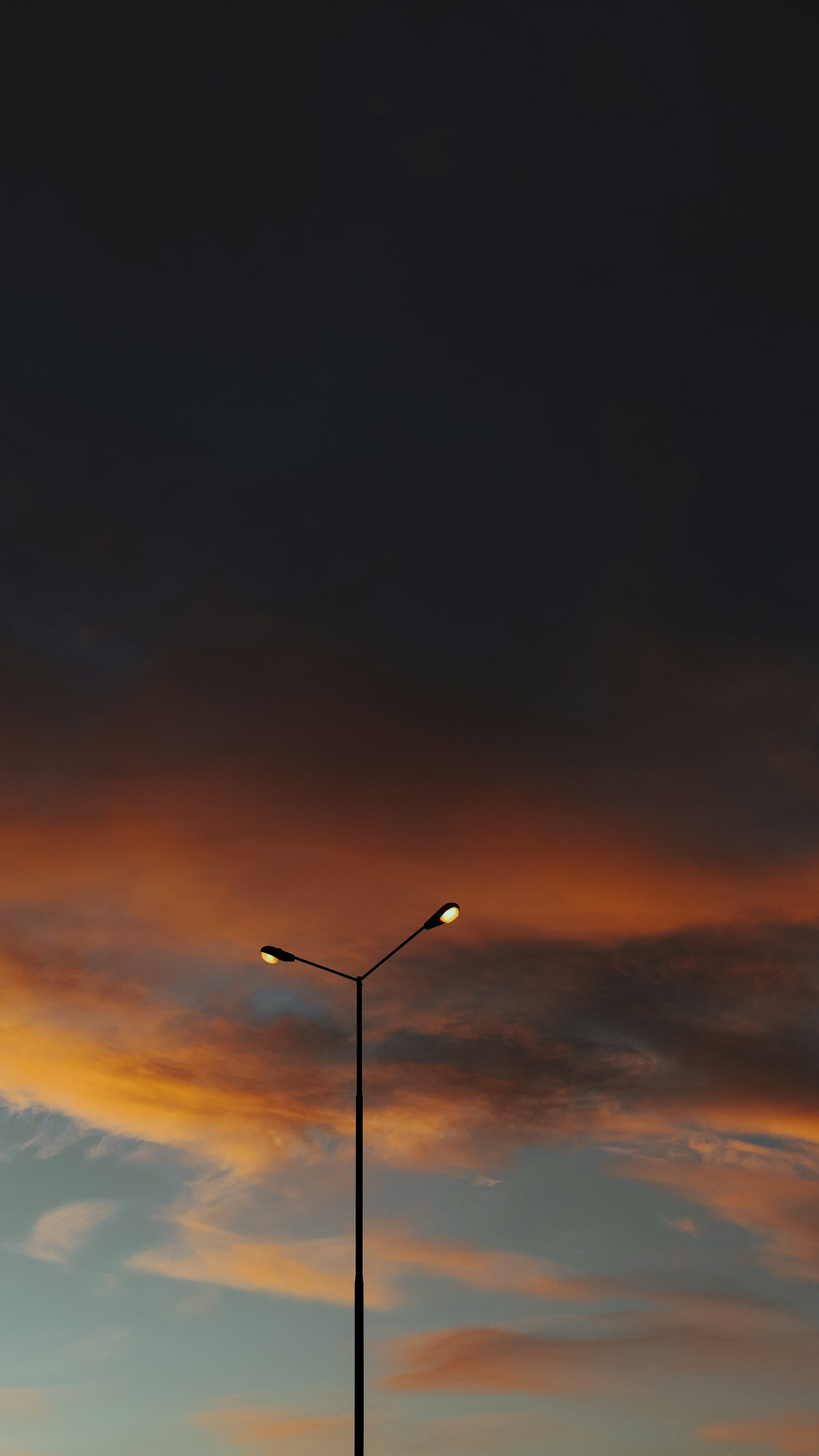 A dramatic wallpaper featuring a solitary black streetlight silhouetted against a vibrant orange and blue twilight sky. Perfect for a moody, urban aesthetic.