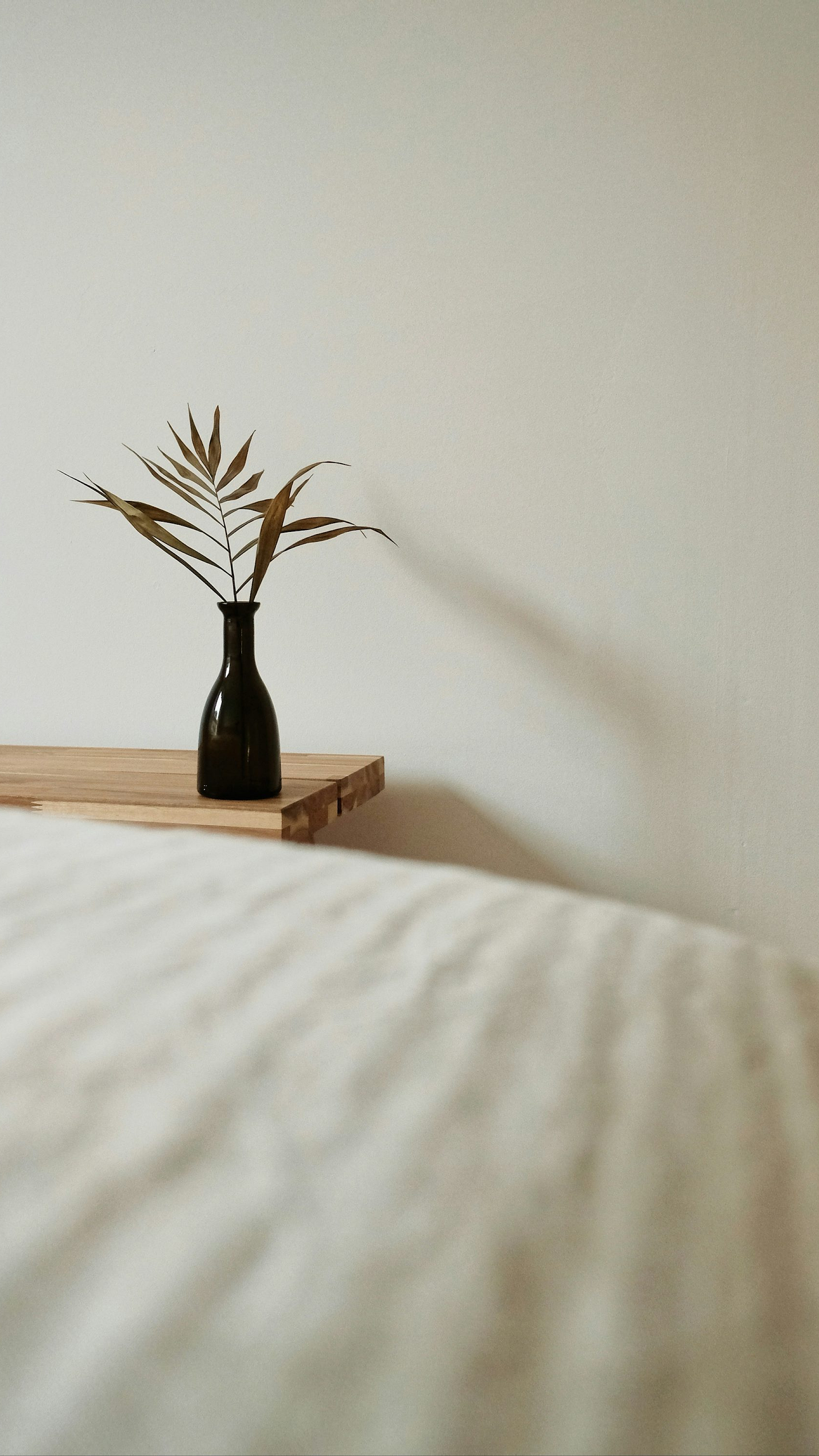 A serene image featuring a brown and green plant resting on a rustic brown wooden table. Perfect for a calming desktop background.