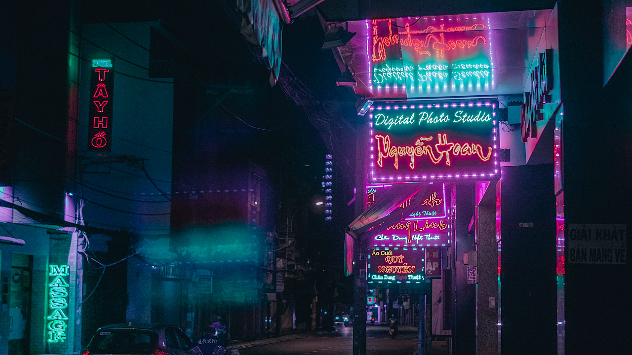 A captivating wallpaper featuring a row of cars parked neatly in front of a store under the night sky. Dark and atmospheric.