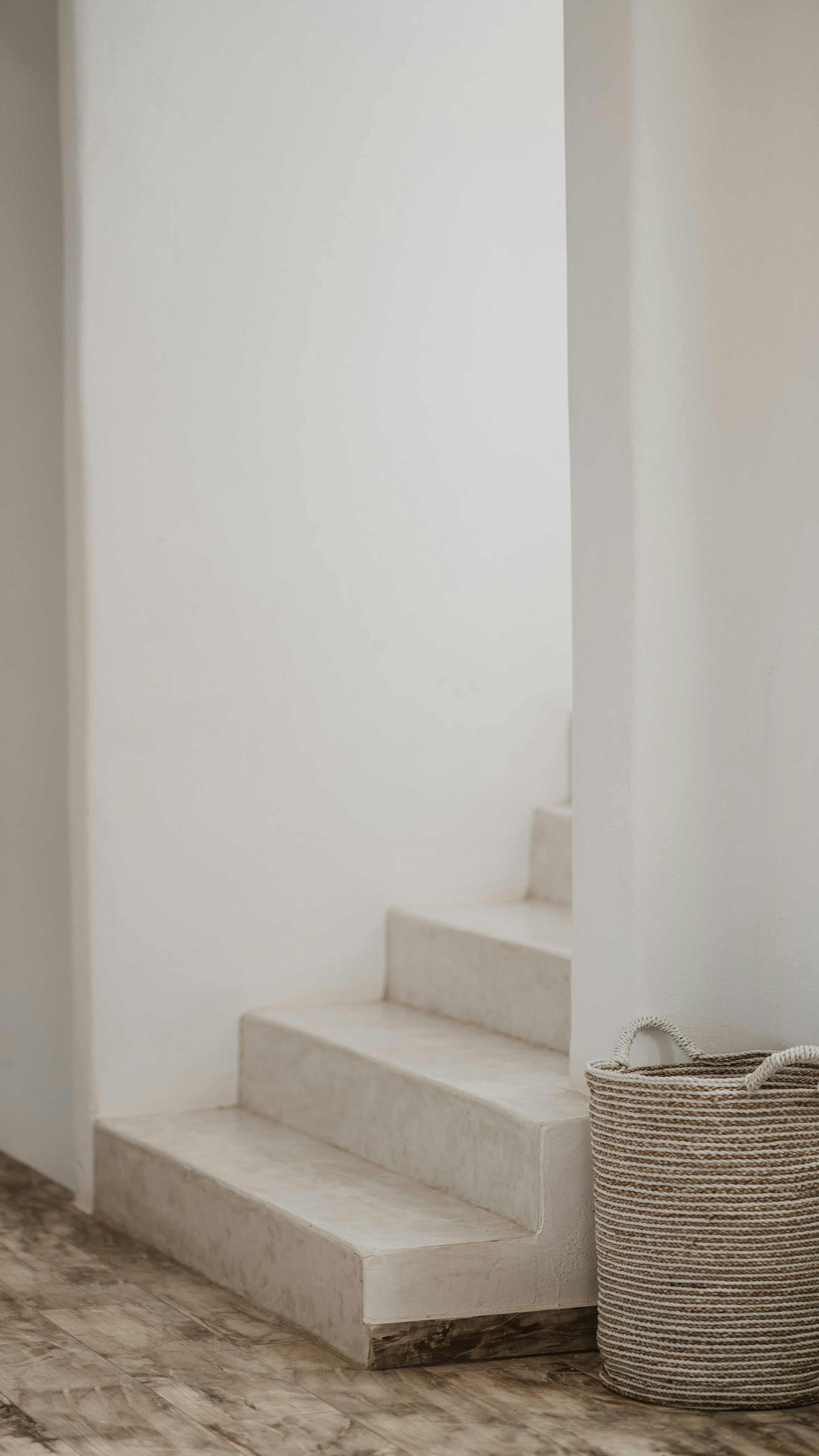 A charming wallpaper featuring a gray wicker basket subtly placed beside a staircase, adding a touch of rustic elegance to any room.