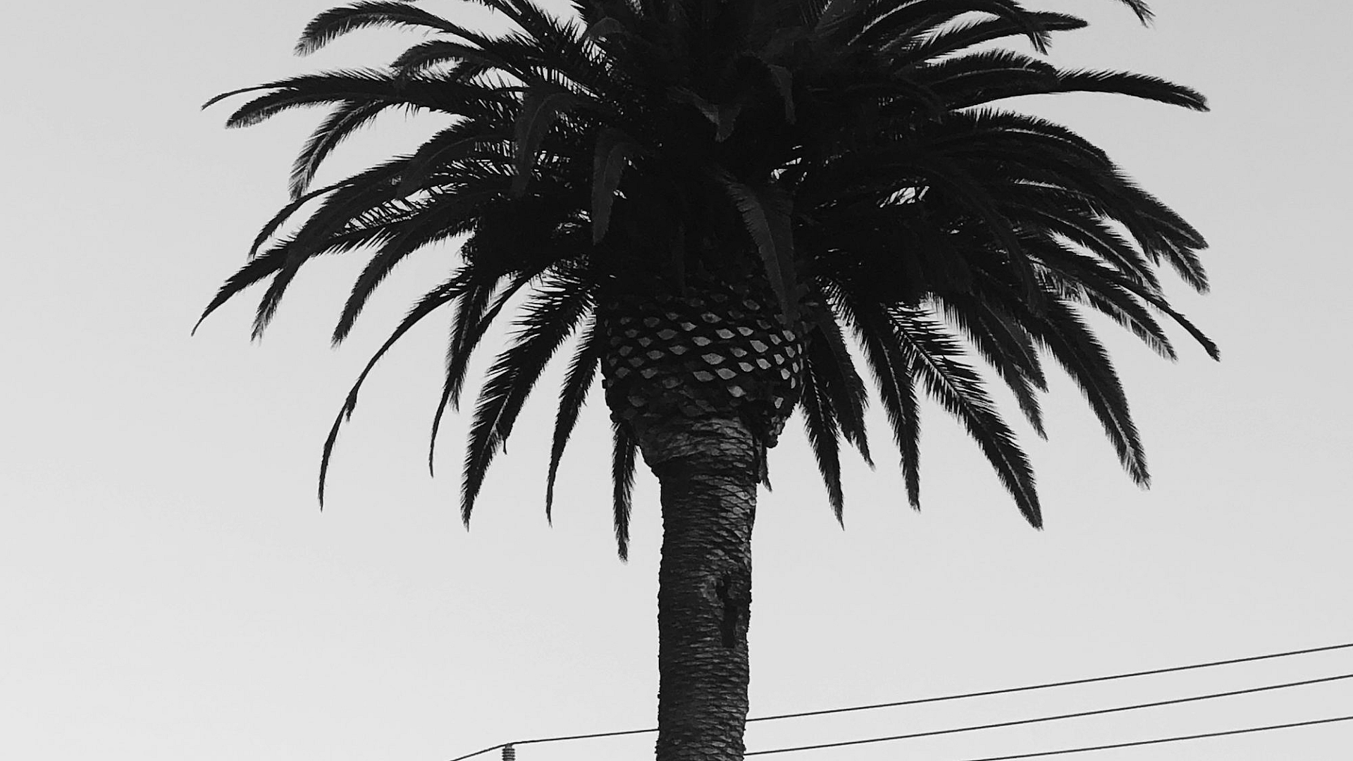 A serene image of a single green palm tree silhouetted against a bright white sky. Perfect for a minimalist or tropical-themed desktop.