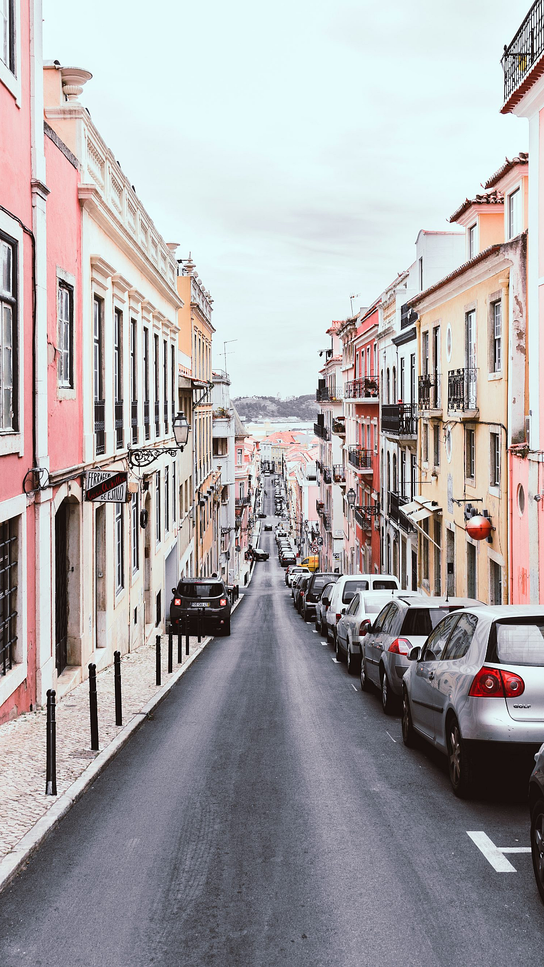 line of vehicles on the right side of a 2-way road in the middle of pink and yellow buildings during day