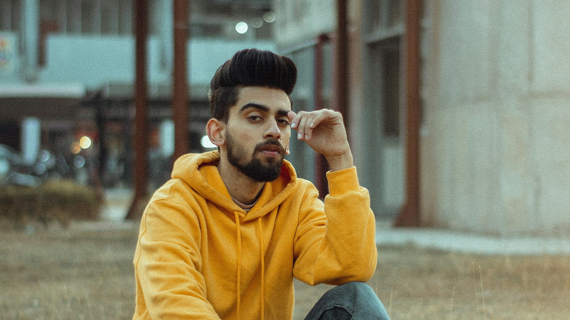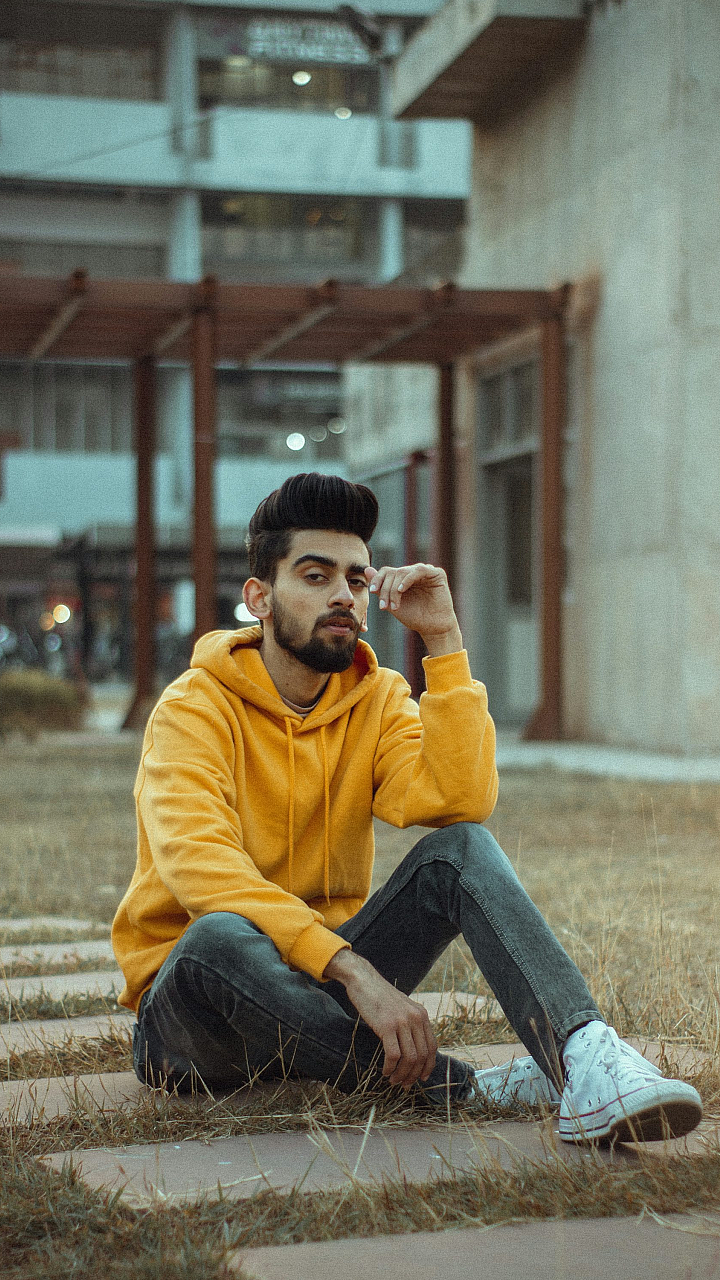 man, yellow hoodie, blue jeans, concrete bench, sitting, daytime, outdoor, wallpaper, urban, casual