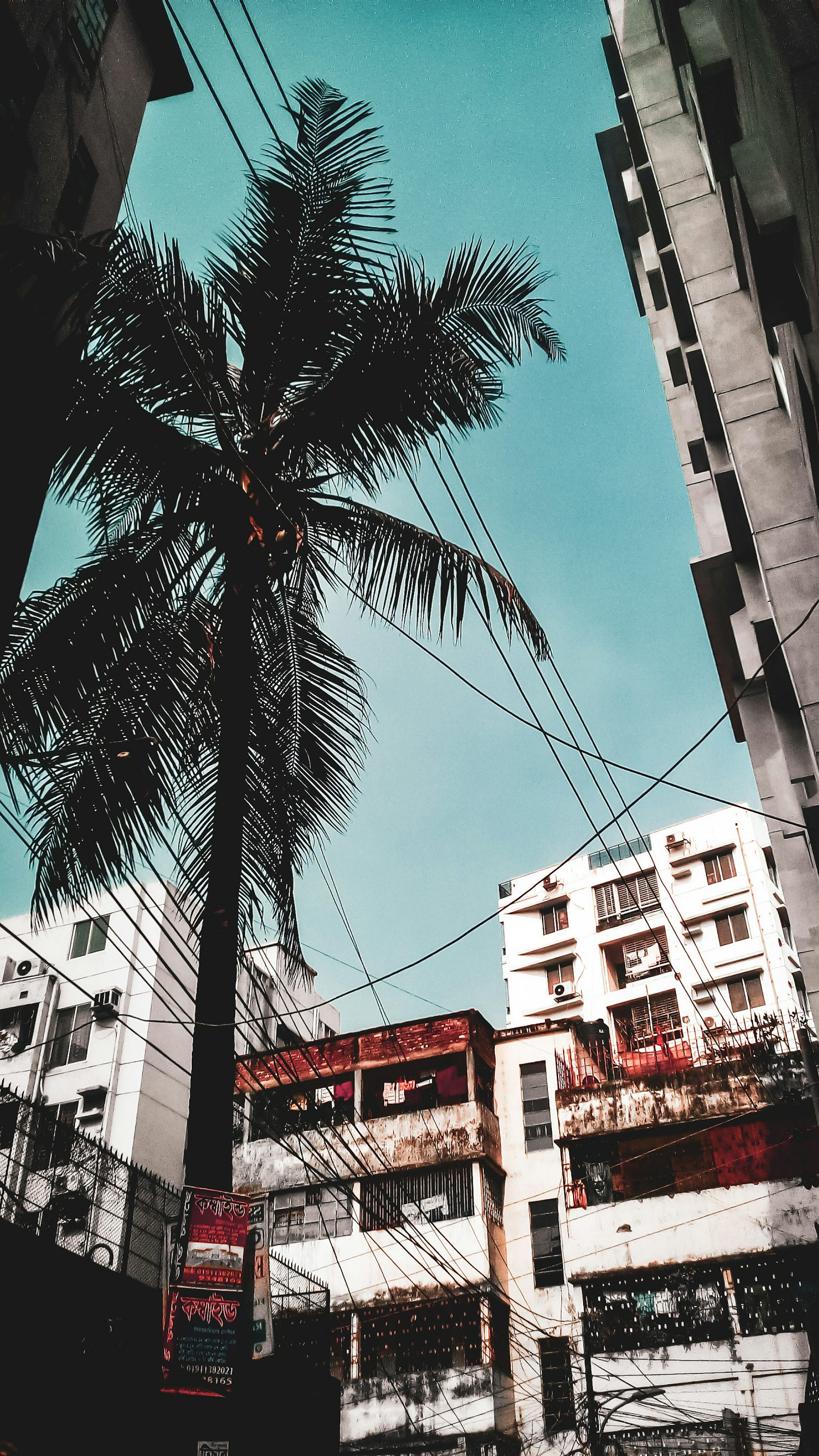 palm tree in the middle of city buildings