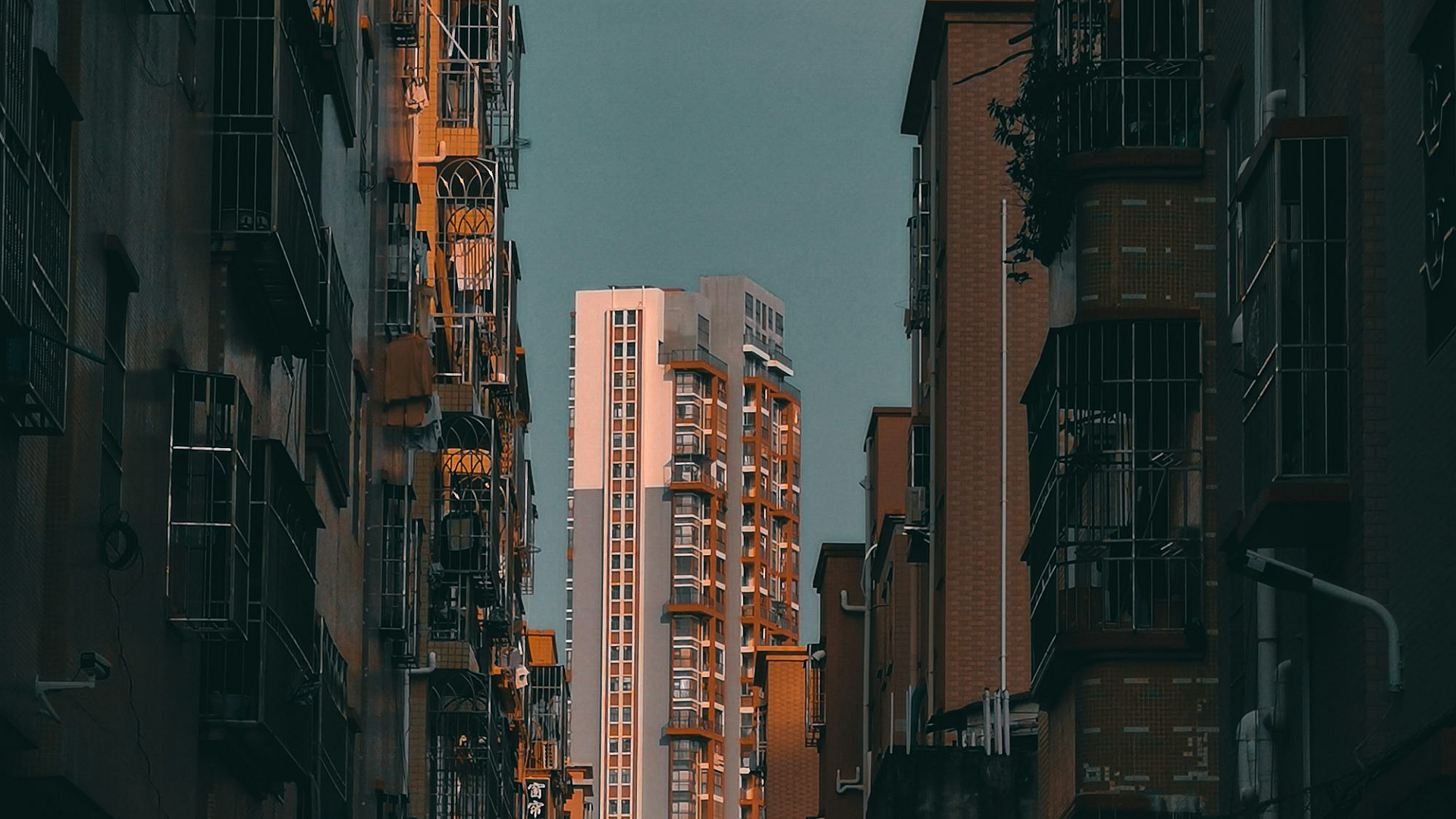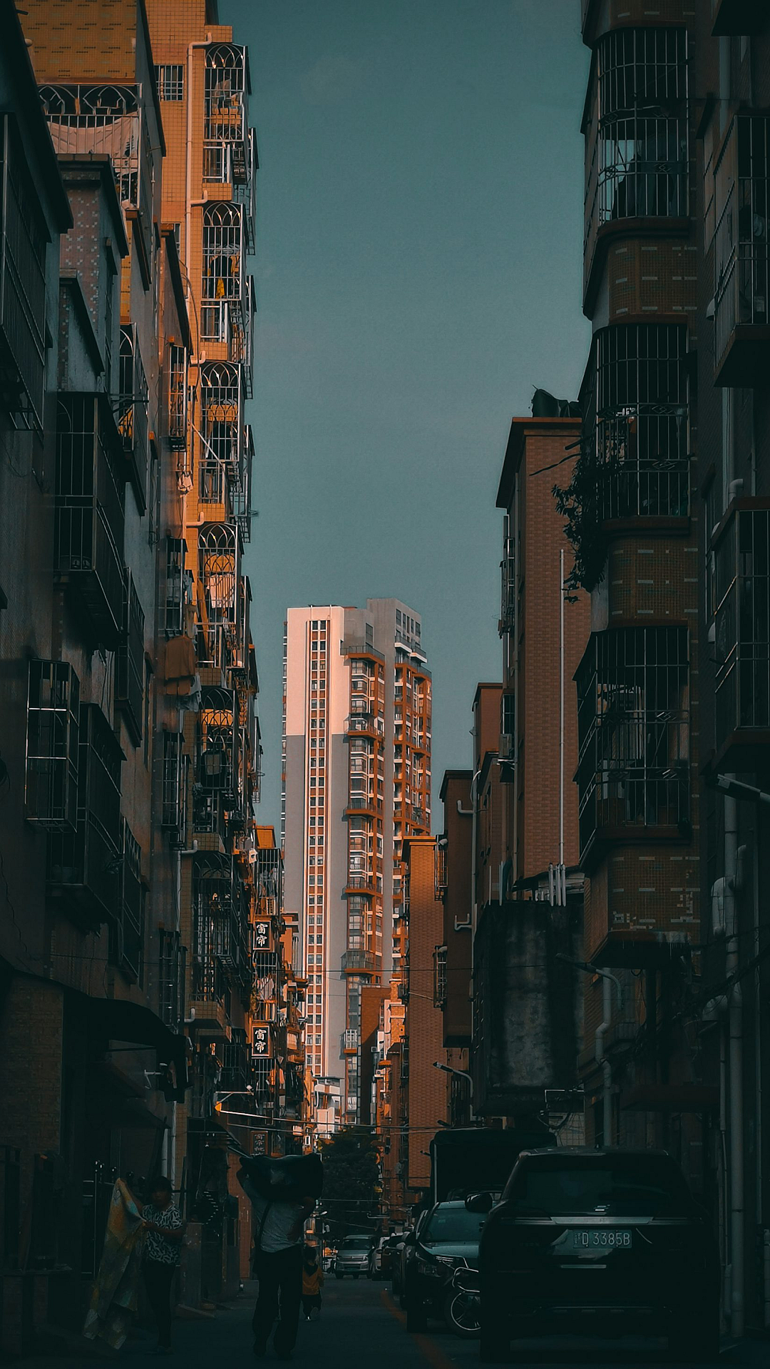 This wallpaper showcases a vibrant city scene with people strolling along a street flanked by imposing high-rise buildings under the bright daytime sun. A perfect depiction of bustling urban life.