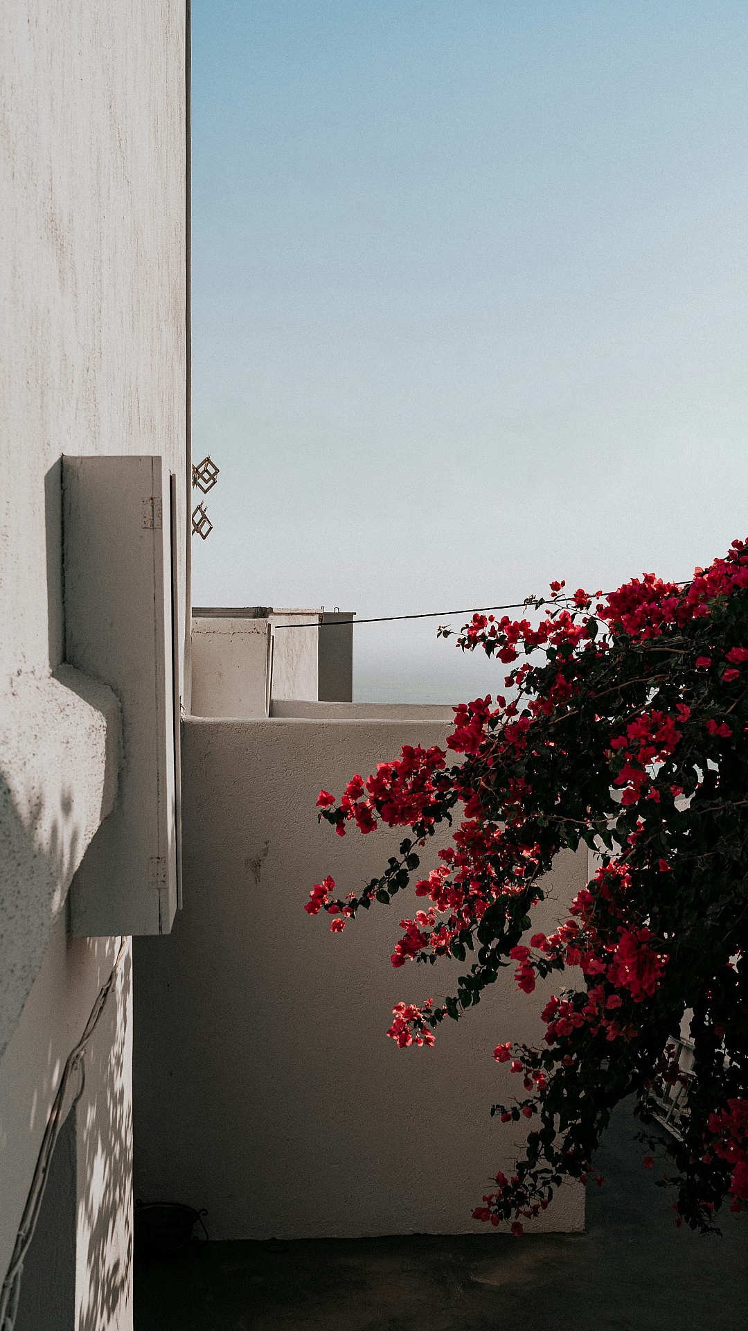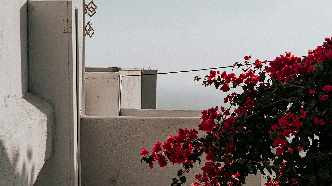 A stunning wallpaper featuring a vibrant red and green leaf tree standing majestically near a clean white concrete building. A perfect blend of nature and urban landscapes.