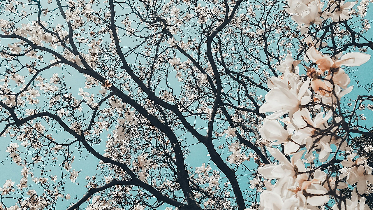 A breathtaking view of a sakura tree in full bloom, showcasing delicate pink flowers against a clear sky. Perfect for a serene desktop background.