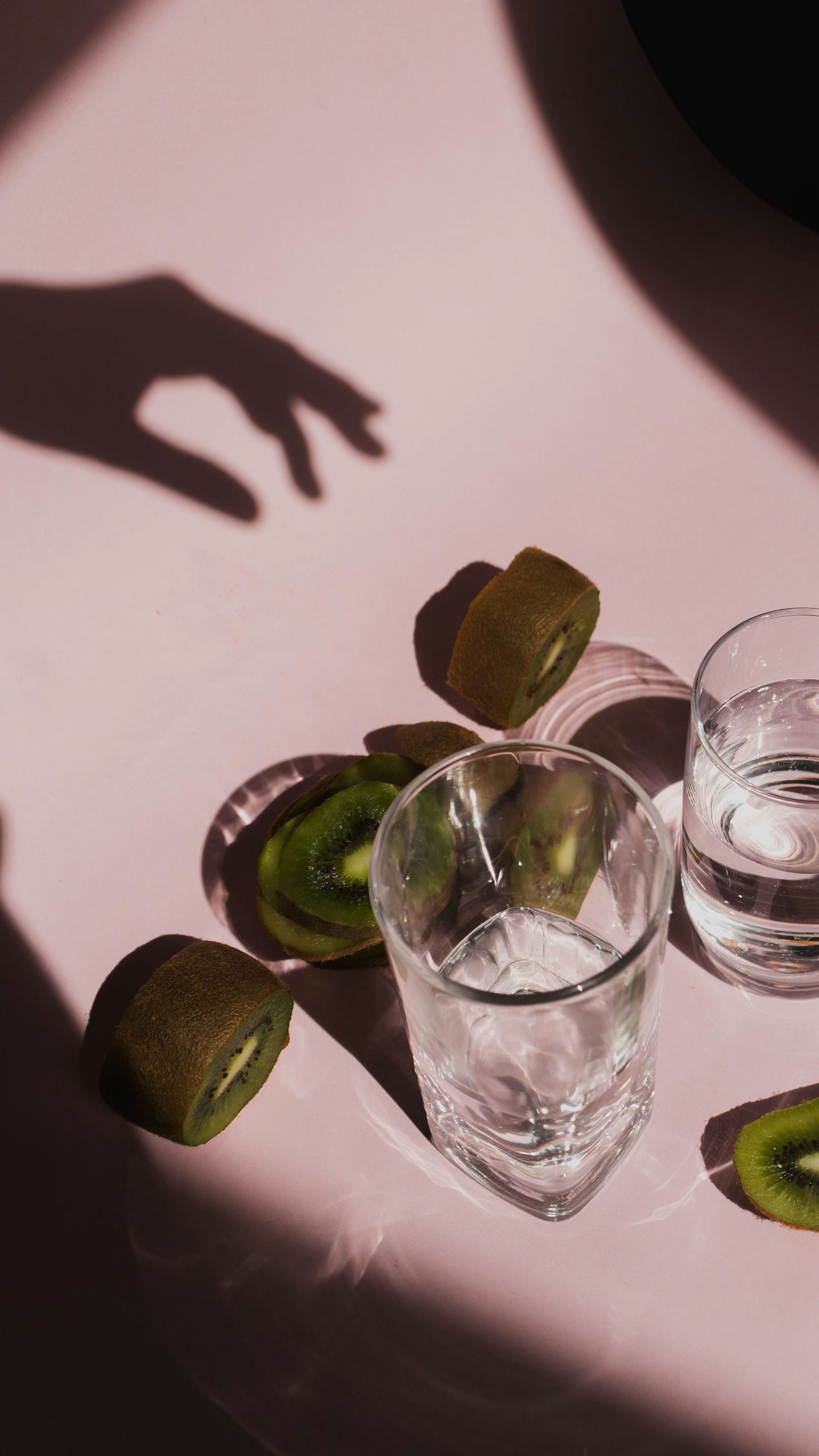 A vibrant wallpaper featuring two clear drinking glasses filled with fresh kiwi fruits. Clean lines and a refreshing aesthetic.