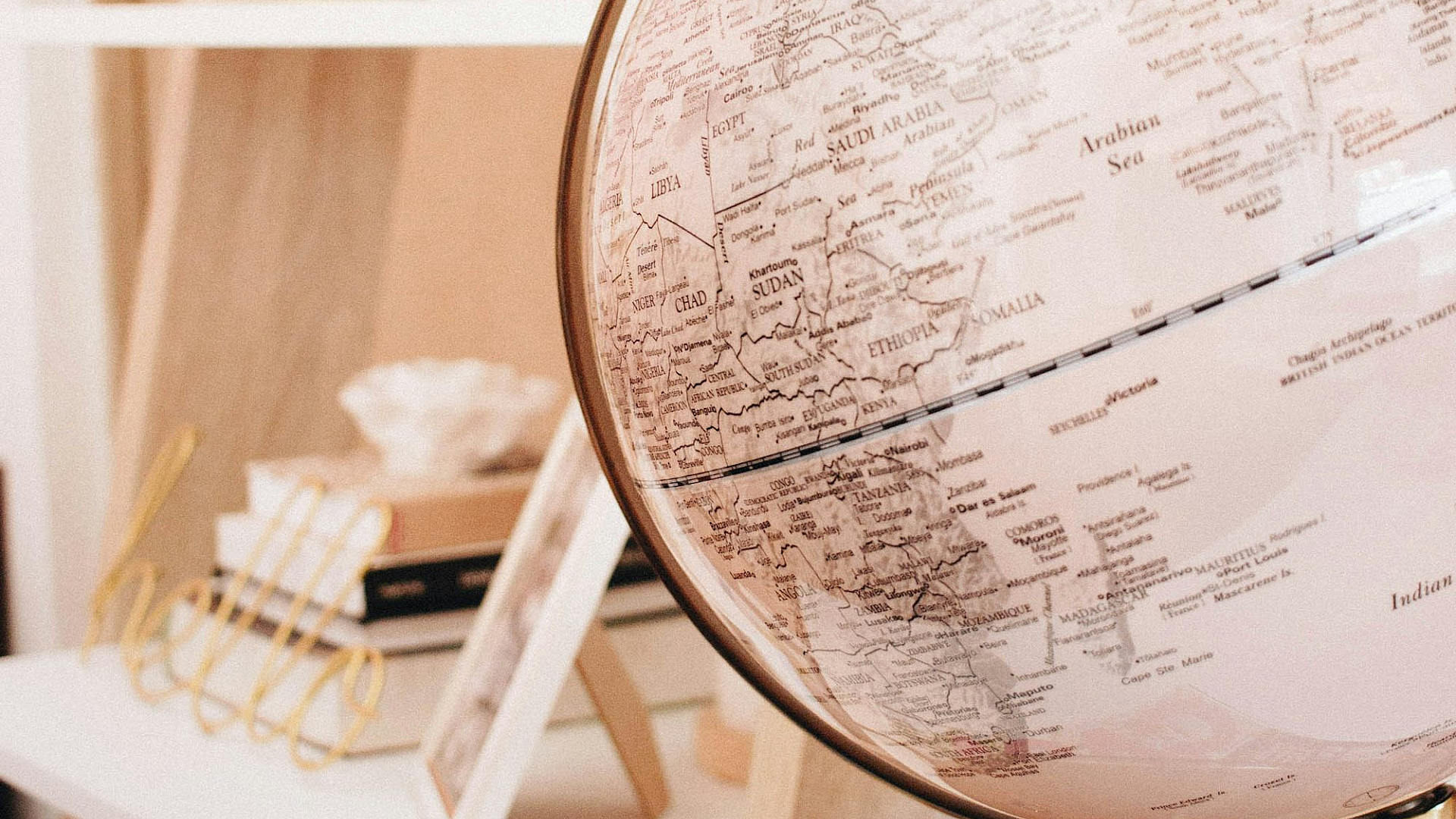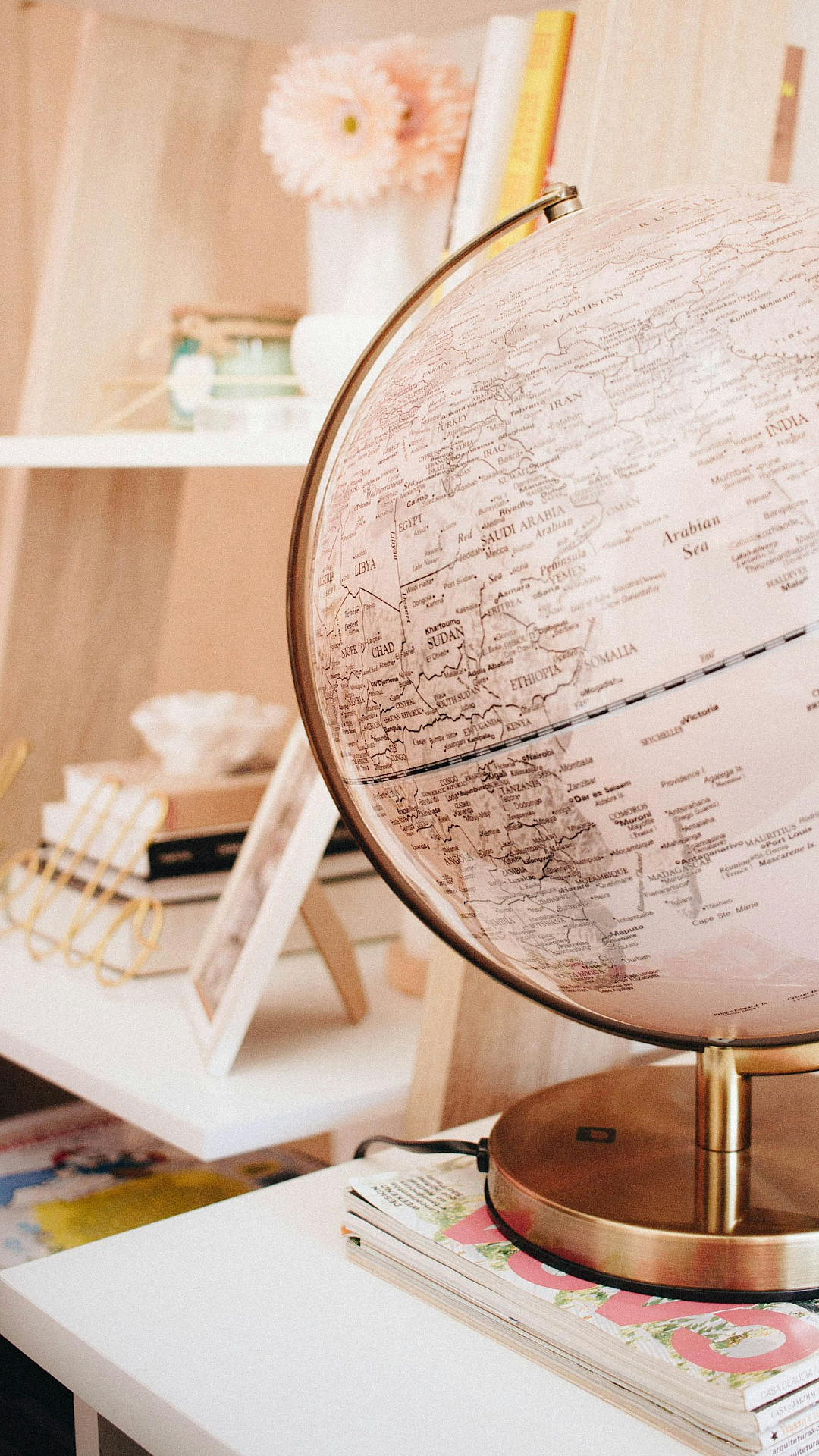 A minimalist wallpaper featuring a white and black desk globe elegantly placed atop a stack of magazines. A clean and stylish image perfect for any desktop.